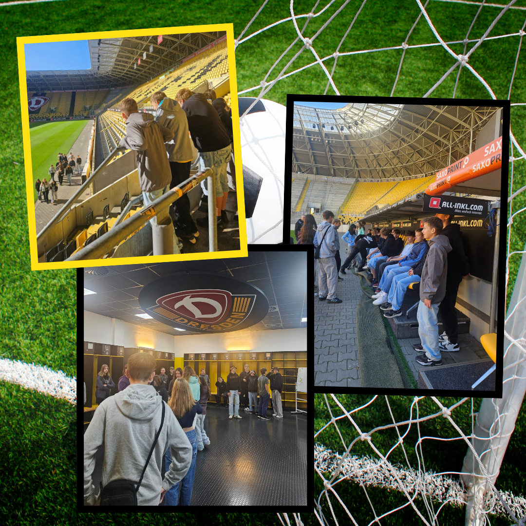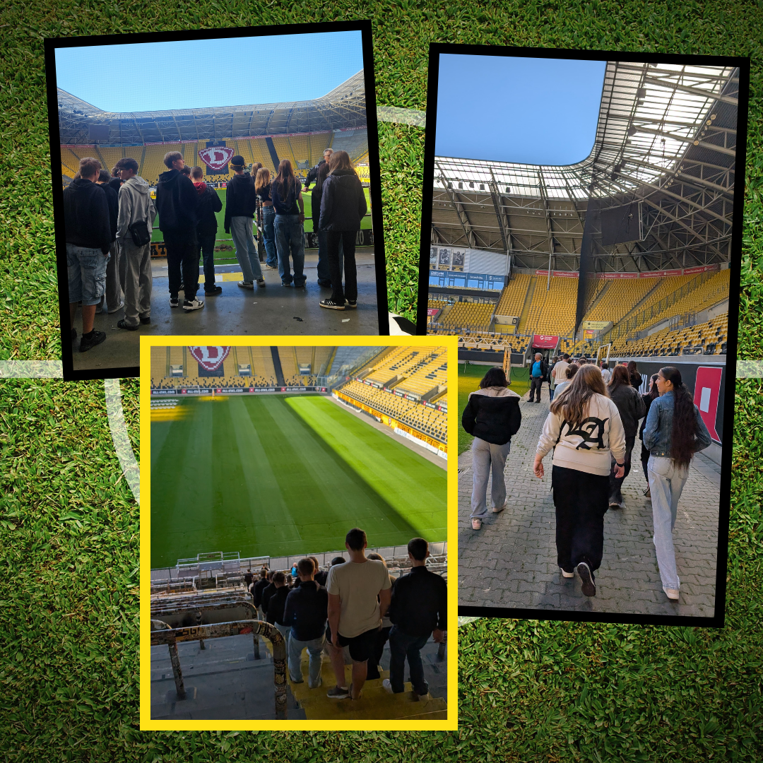 Im Rahmen der Berufsorientierung nahmen unsere beiden 8.Klassen am 29.09.25 an einer Führung durchs Rudolf-Harbig-Stadion in Dresden teil. Neben interessanten Informationen zum Fußballverein Dynamo Dresden sowie zur Geschichte des Stadions wurden auch verschiedene Berufsfelder im Kontext Fußball vorgestellt. Mit vielen Bildern vom K-Block, der Mannschaftskabine, dem Presseraum sowie den VIP-Logen ging es anschließend in die Innenstadt, wo die Schüler noch etwas Freizeit auf der Prager Straße genießen durften, bevor sie der Zug trotz reichlich Verspätung glücklich und zufrieden wieder in die Heimat zurückgebracht hat.